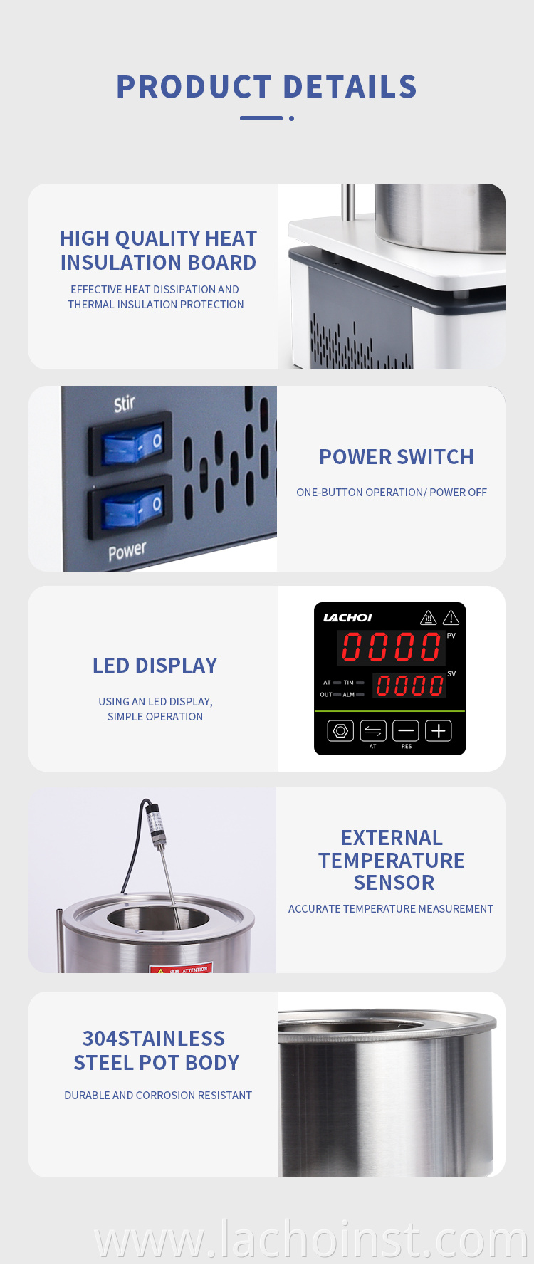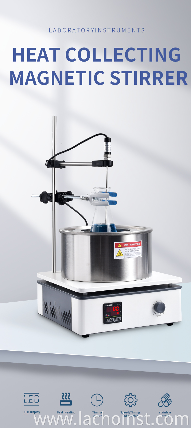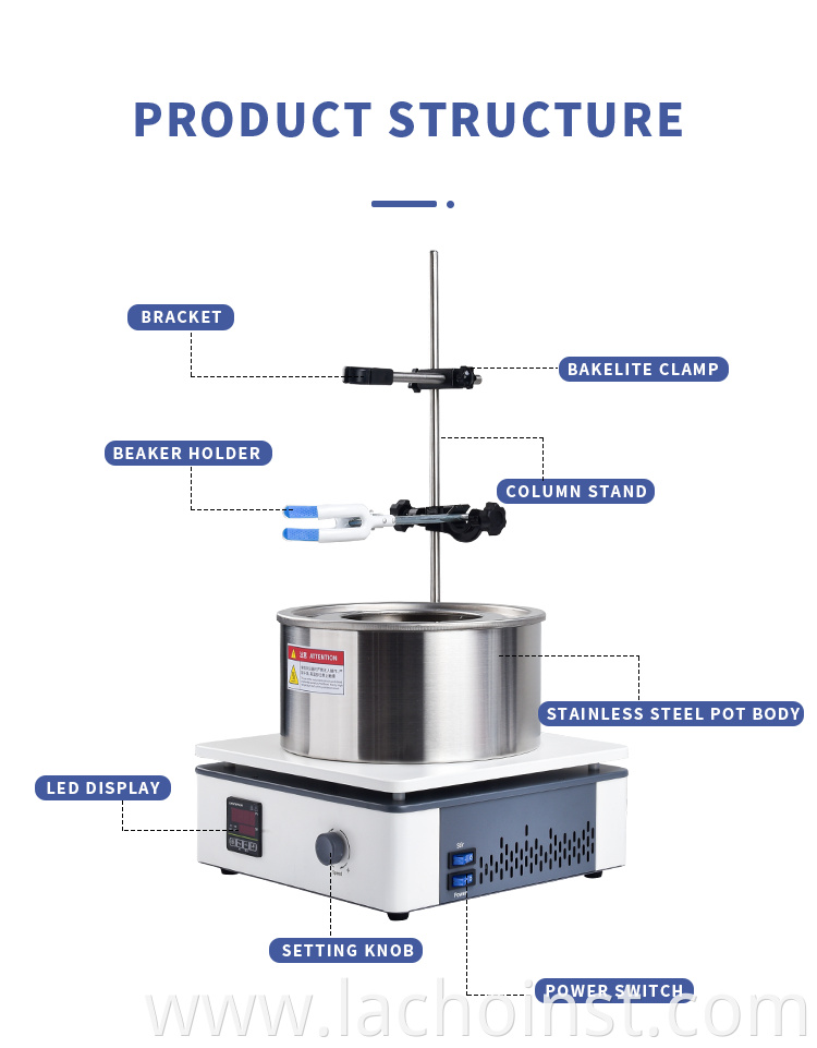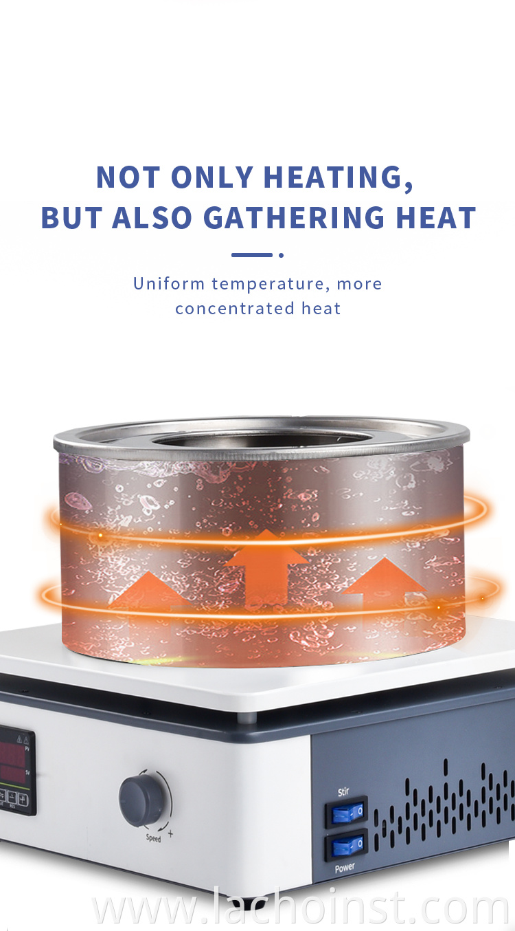 Heat Collecting magnetic stirrer adopts collector-type heating method and the heateocontainer is completely exposed to strong thermal radiation.The collector pot is stampeofrom high-quality stainless steel, combinedwith a special heating tube and a high-temperature seal. The motor adopts DC brush motor the speed is stable and reliable.and the noise is low. Water (Water Bath), oil (oil bath) can be added,and the heating temperature fluctuation is small, so that the reactants can be heatedevenlylt is an ideal necessary tool for laboratory personnel in universities, environmentalprotection, health, epidemic prevention, petroleum, chemical, medical and other units.
