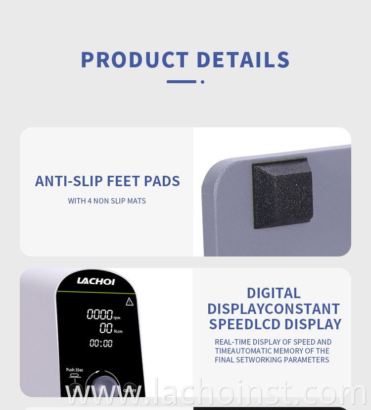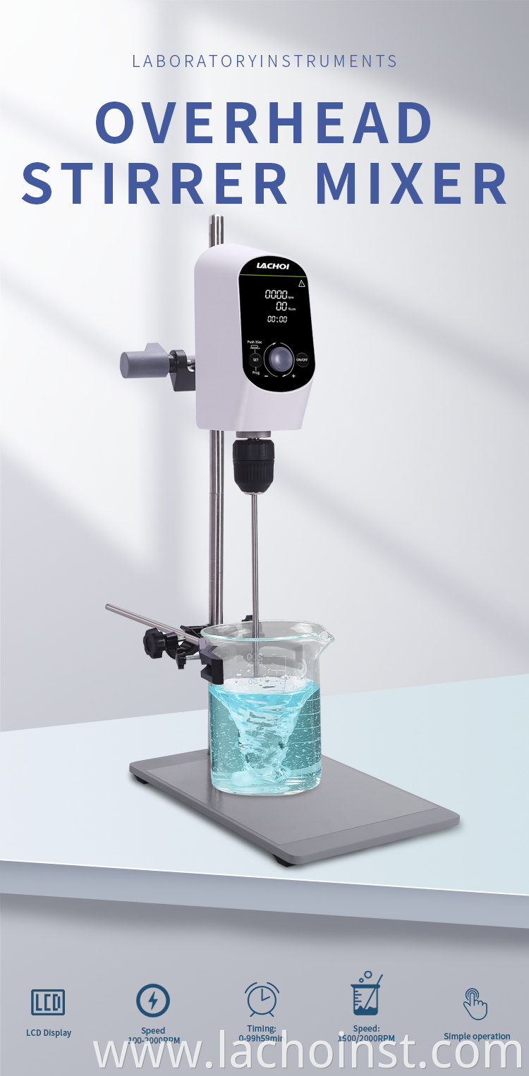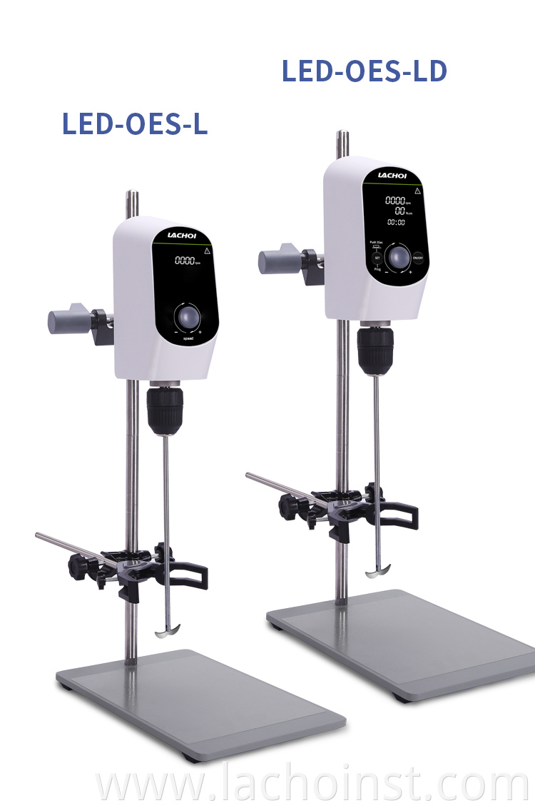 The OES Series Overhead stirrer is suitable for mixing and stirring of low, medium and highviscosity liquids in the laboratory. The mixing host adopts high-quality engineering plasticsas the body, and the running state is stable; the output end uses a variable speed boostermechanism to double the output torque; the running speed can be set arbitrarily accordingto the needs of the experiment, and the digital display intuitive mixing speed to ensure datacollection lt has the characteristics of built-in soft start, automatic overload protection, anofull-process constant power compensation.