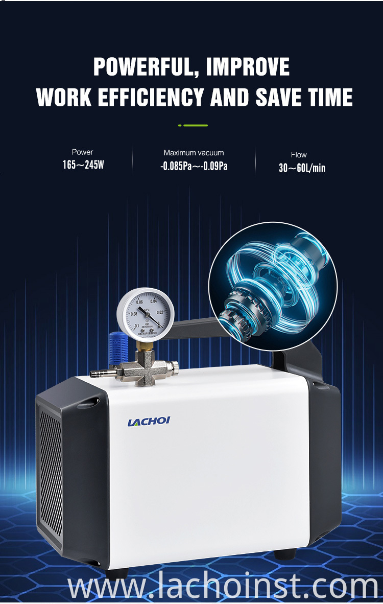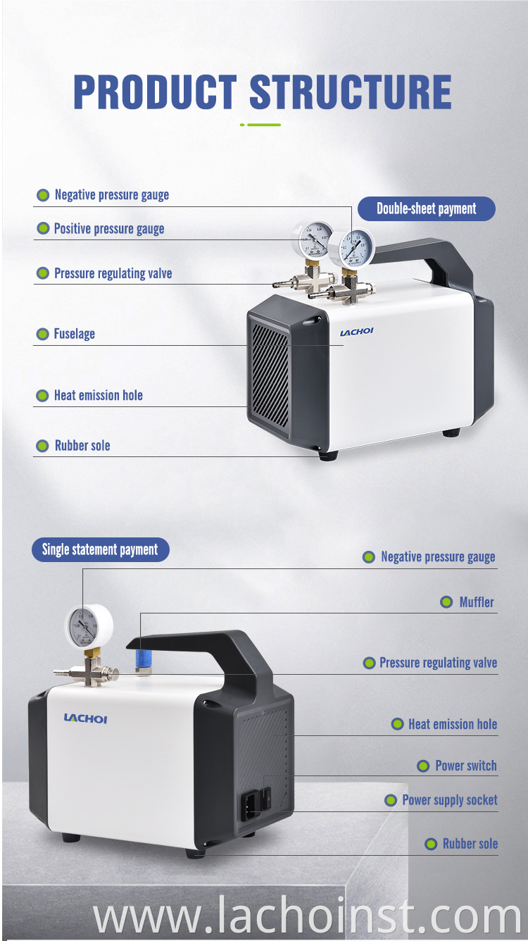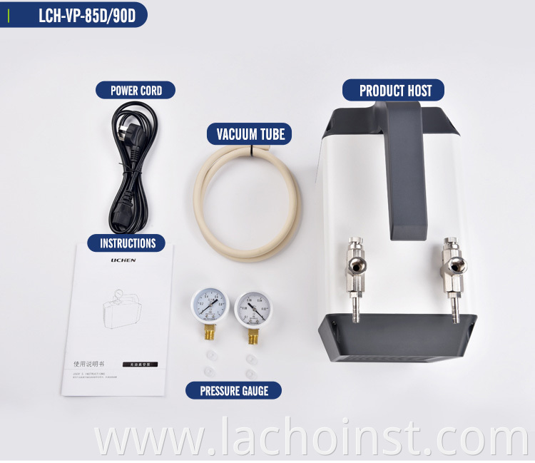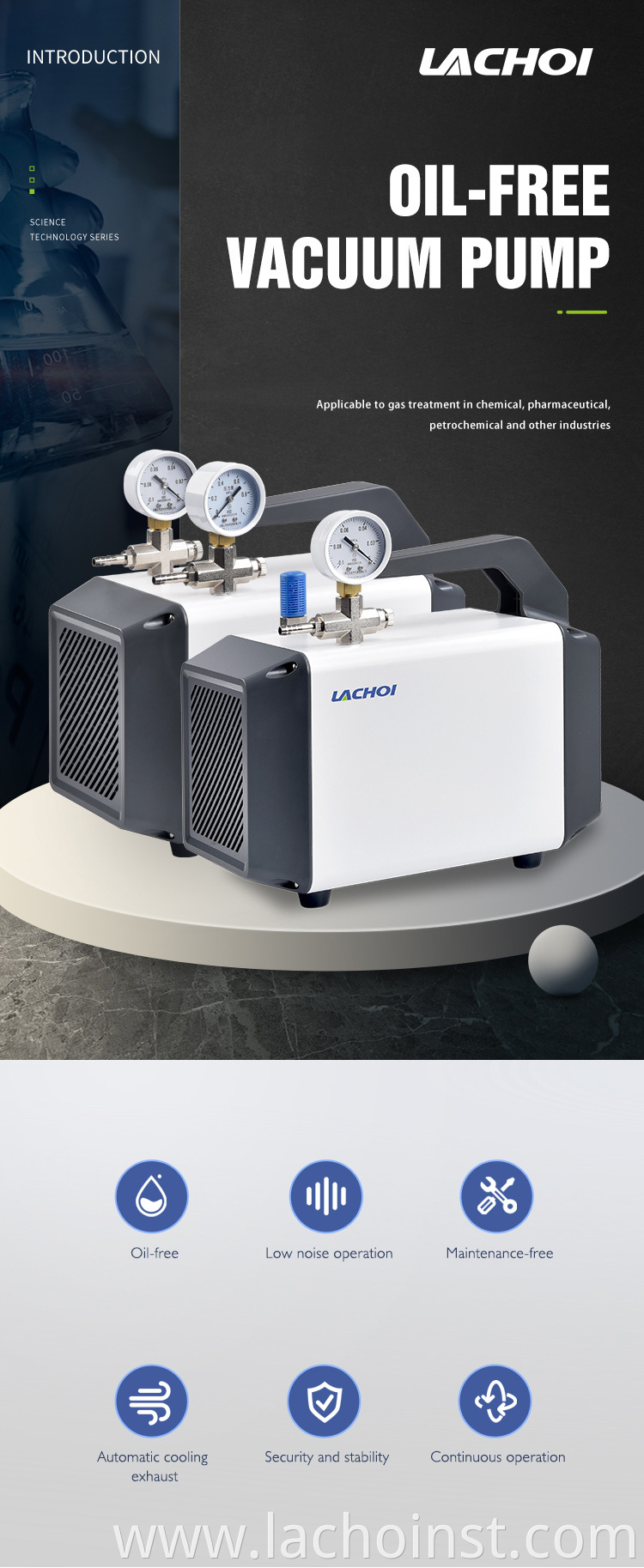 VP series oil-free vacuum pump can operate continuously without oil, with low noise, high efficiency ancong service life. lt is suitable for gas treatment in chemical, pharmaceutical, petrochemical and otheindustries, such as vacuum distillation, vacuum concentration, solid phase extraction, etc, lt is one of thenecessary equipment in the laboratory.